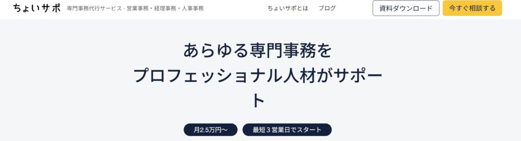 日本エキスパートホールディングス株式会社が運営する「ちょいサポ」は、営業事務・経理・人事・総務など、幅広い専門事務を月額2.5万円からご利用いただけるBPOサービスです。