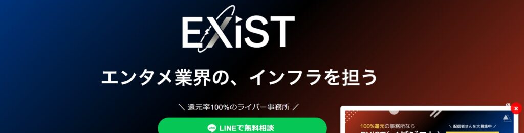 EXiST は、「エンタメ業界のインフラを支える」というミッションを掲げて活動するライバー・Vライバー事務所です。還元率は100%と高く、サポート体制も充実しており、グッズ制作や販売のサポートも提供しています。