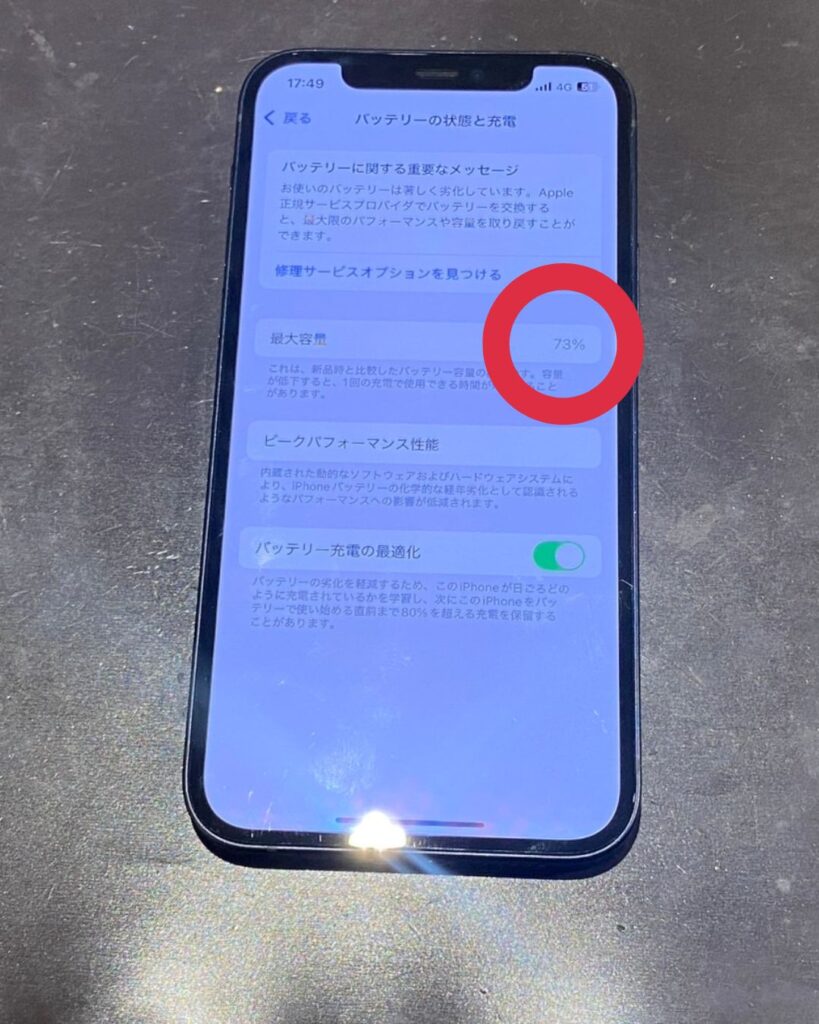 これはだいぶバッテリーが弱っている状態です…。ここまで弱っていると充電の減りが早いだけでなく冬場になると突然シャットダウンを起こしてしまう恐れがあります。