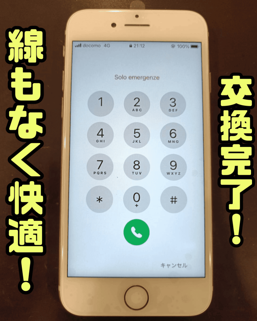 画面交換後のiPhone8です。起動させてしばらく様子を見ましたが、横線が降ってくる気配はありません。どうやら改善されたようですね。