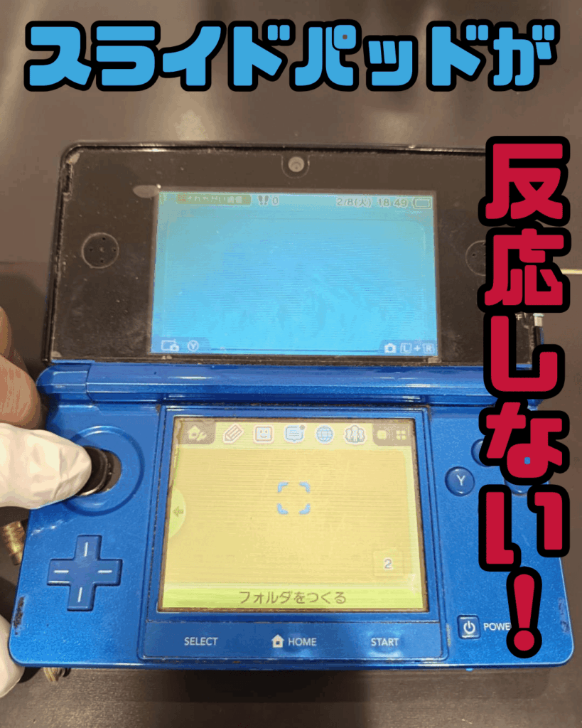 ご相談者様が久々に起動させたところ、スライドパッドの効きが非常に悪くなっており、右と右下は反応するようですが、それ以外の方向は全く受け付けない状態になっているようです。