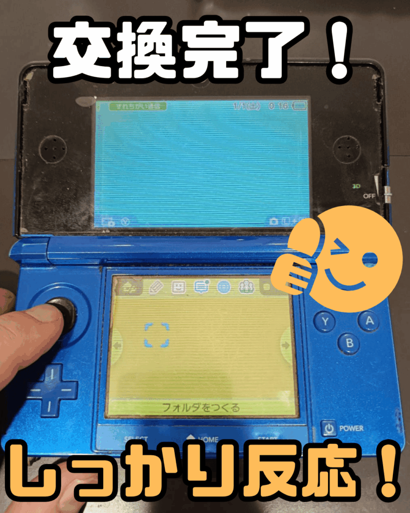 ゆっくり、慎重~~~に修理を行いスライドパッドを交換し、本体を起動させ確認してみたところ・・・