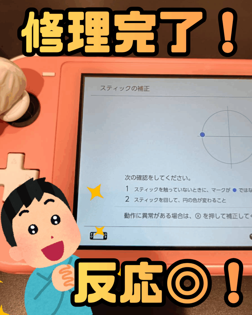 アナログスティックを交換し動作確認を行うと、しっかり円に沿って回る様になりました。