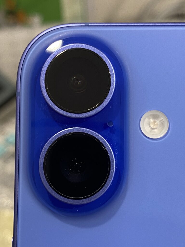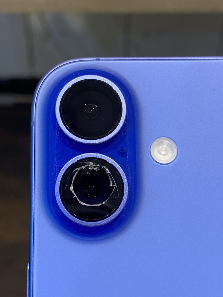 こちらのiPhone16、背面のカメラレンズのひとつが大きく割れてしまっていますね。