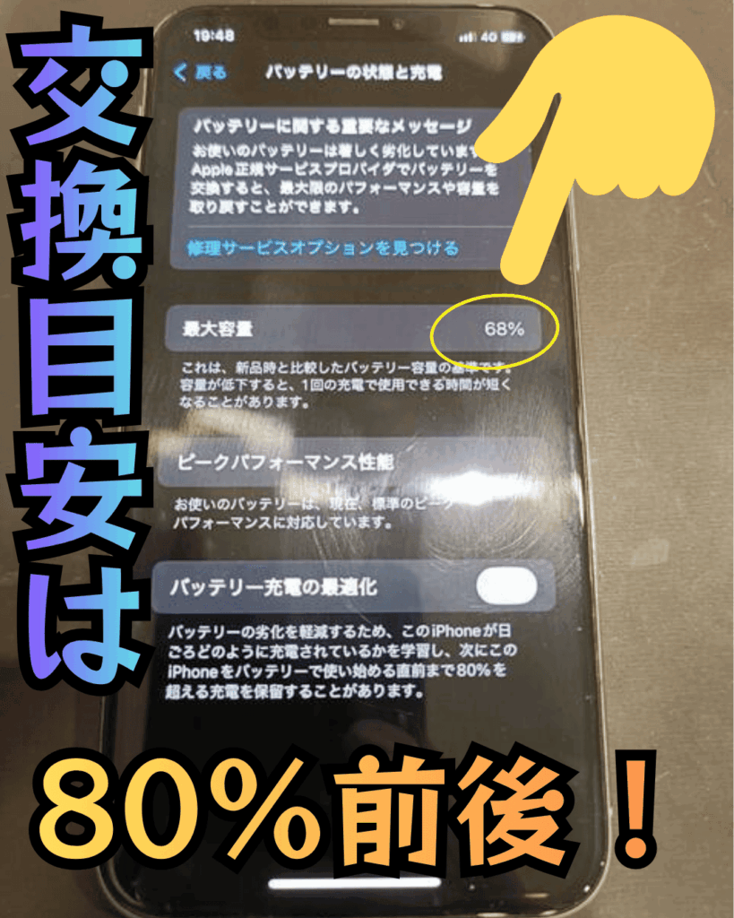 それらの重篤な症状を未然に防ぐため、Apple公式では最大容量の80%前後を交換時期の目安と定めていて、実際80%を下回ると最大容量の上部に交換を推奨するメッセージが表示されるようになります。