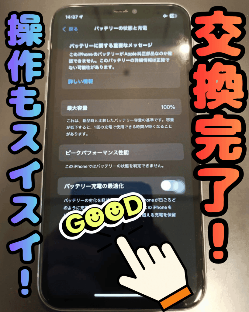 お預かりしたiPhone11Proもバッテリーを交換し最大容量は100%!動作も滑らかスイスイです!