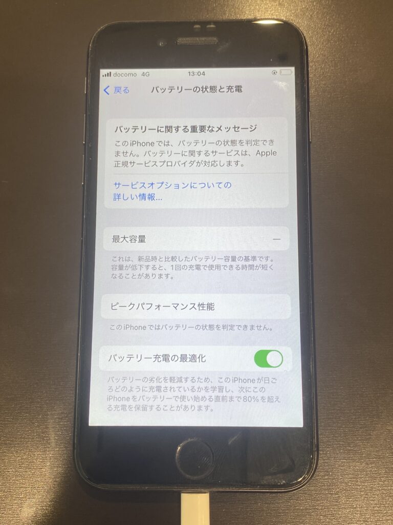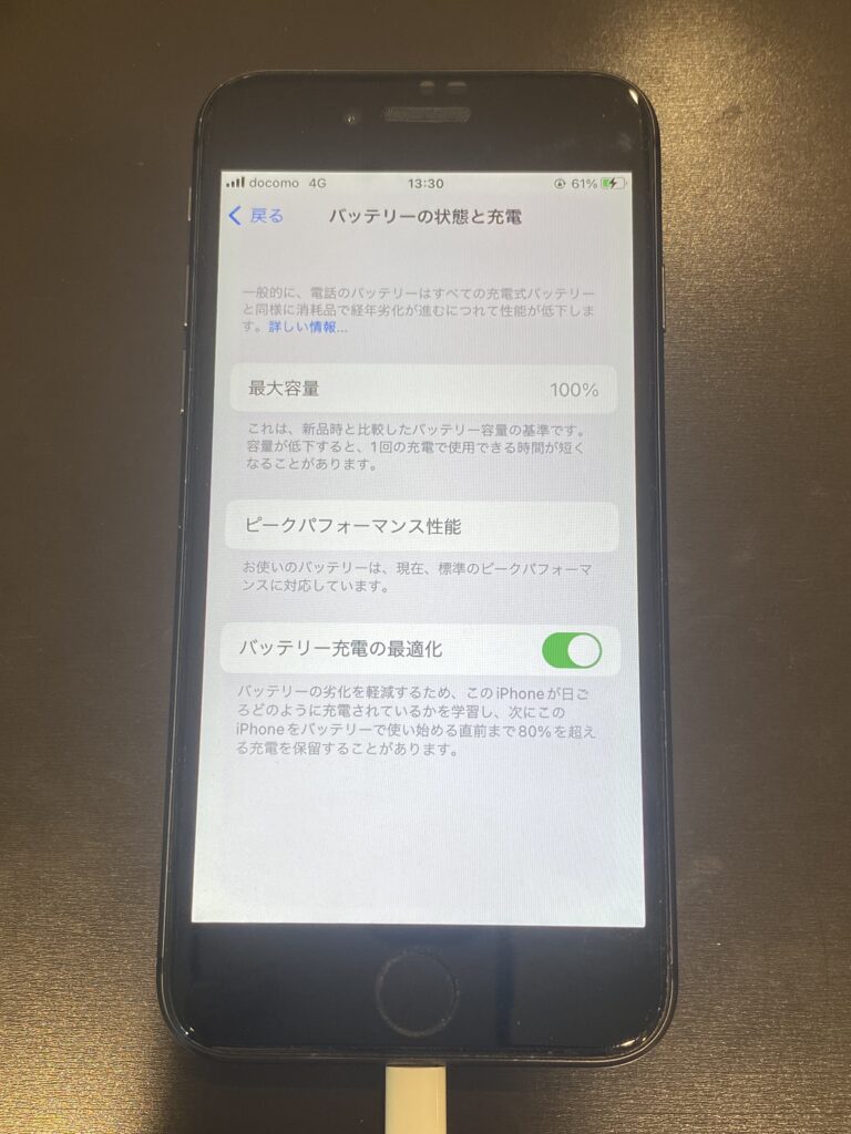 先程のiPhoneも交換することでこのように最大容量が100%と表示されるようになり、警告メッセージは表示されなくなりました。