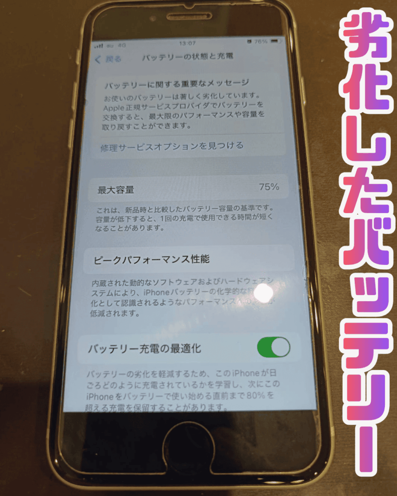 バッテリー状態を診るため最大容量という項目を確認すると75%と表示されており、その上には劣化を知らせるメッセージまで出ています。これはかなり劣化している状態です。