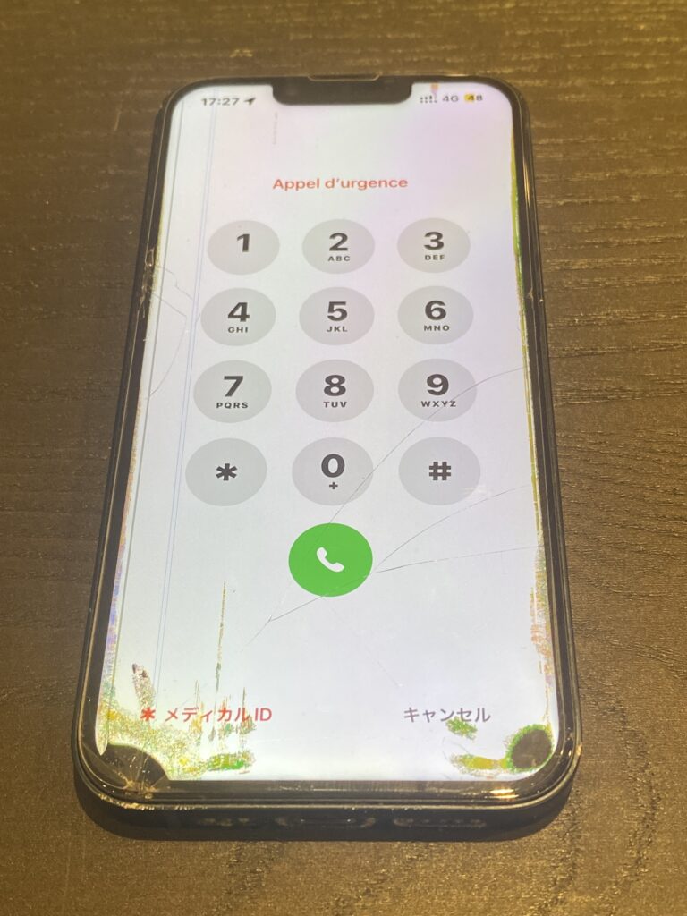 よく見ると画面の左下側から中央に向かって割れているのも確認できます。