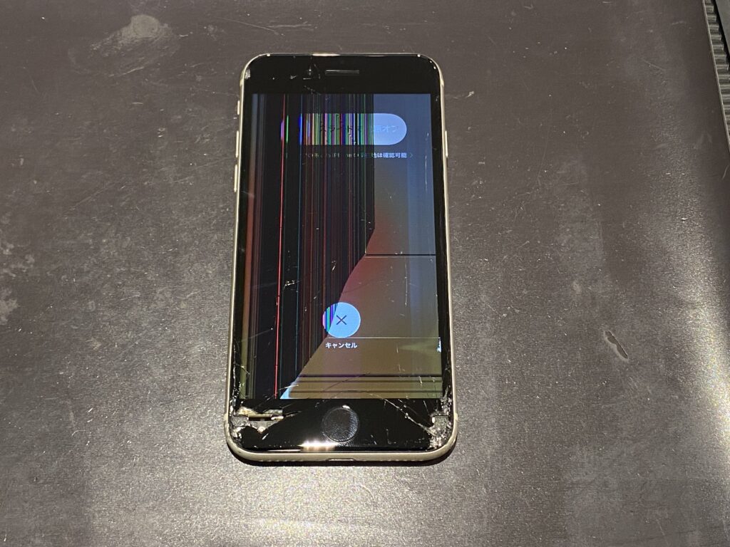 こちらのiPhoneSE2も例外ではなく、お分かりのように液晶に大きく無数の線が表示されてしまっており、下部両脇は割れていたりガラスが欠けています。