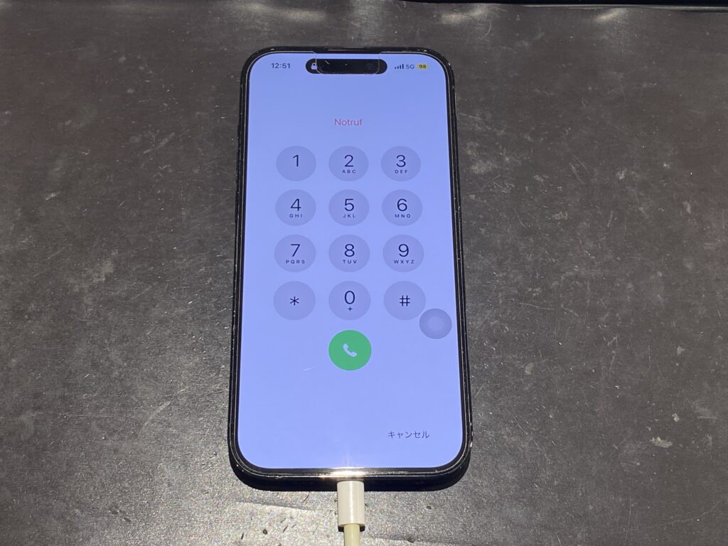 こちらのiPhone14Pro、充電ケーブルを挿しているのですが、右上に表示されているバッテリー残量を見てみると充電のマークは表示されておらず、充電されていないのが分かります。