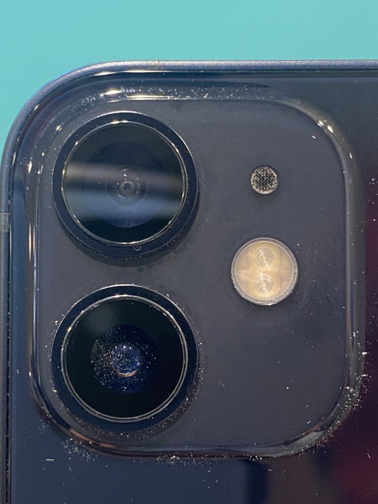 こちらのiPhone15、二つあるカメラレンズのうちの片方、下側のレンズがほんの少しだけ欠けてしまっており、ほこりなのかレンズ全体に白い汚れが付着していますね。