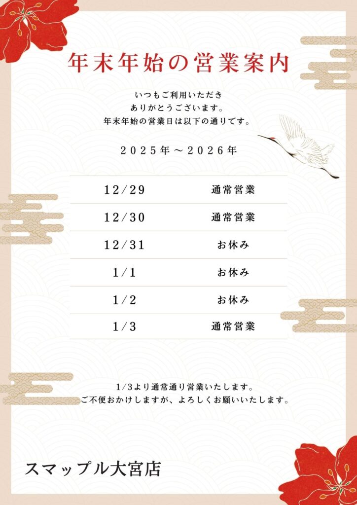 スマップル大宮店は明日まで通常営業でオープンしておりますので、年内中の修理をお考えでしたら是非ご利用ください!