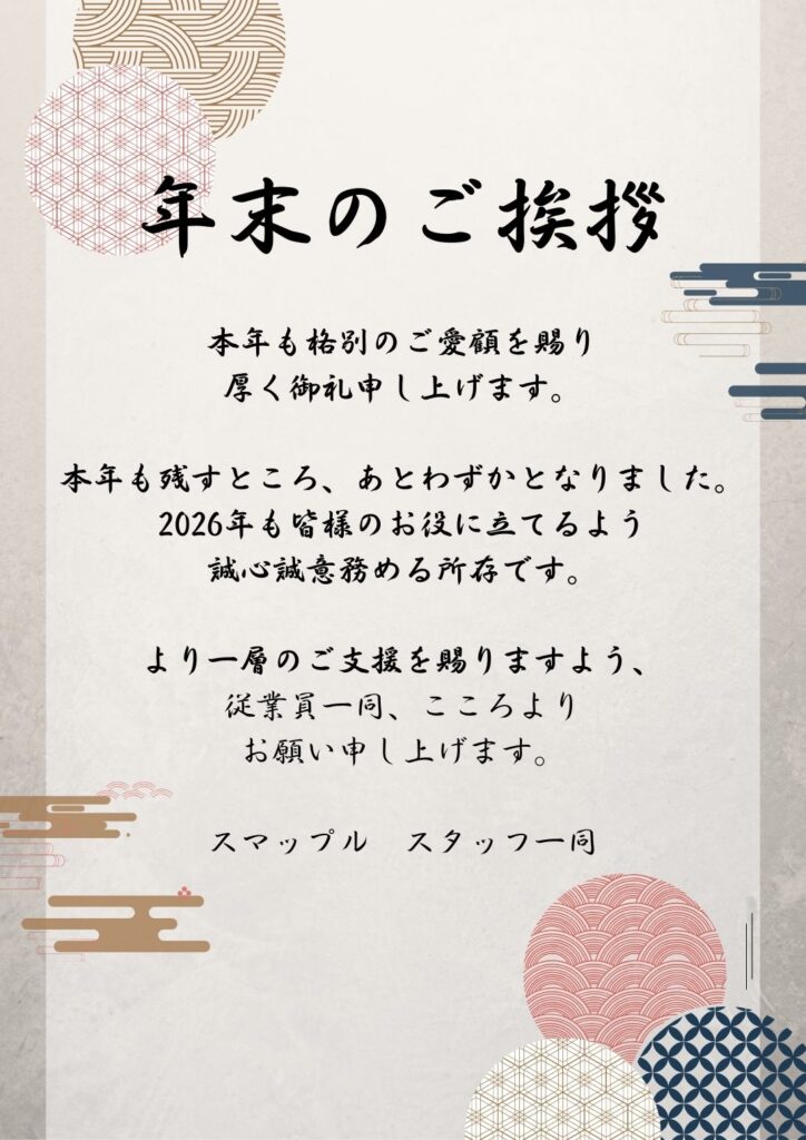 年末年始のお休みは2025/12/31~2026/1/2の期間となります。