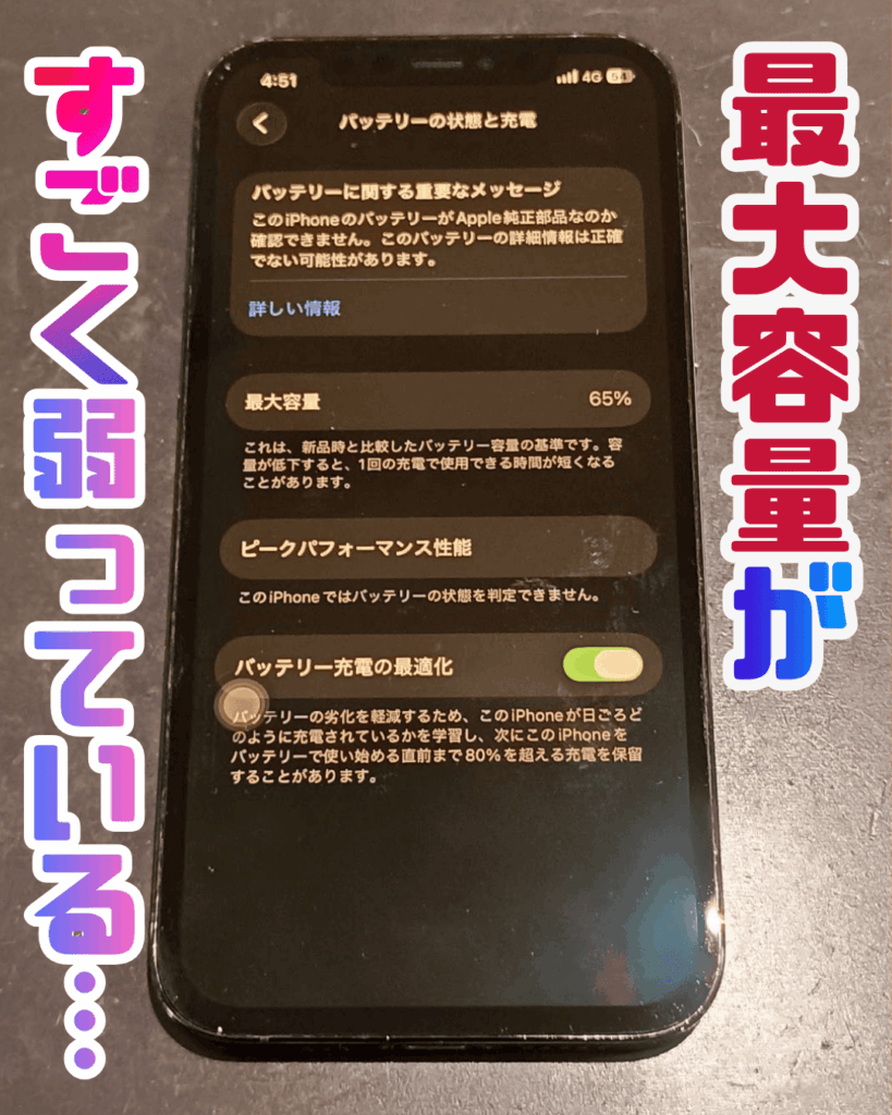 バッテリーの最大容量(健康度)を確認してみると65%!新品当時と比べて6割半の性能しかないほど弱っているようです…