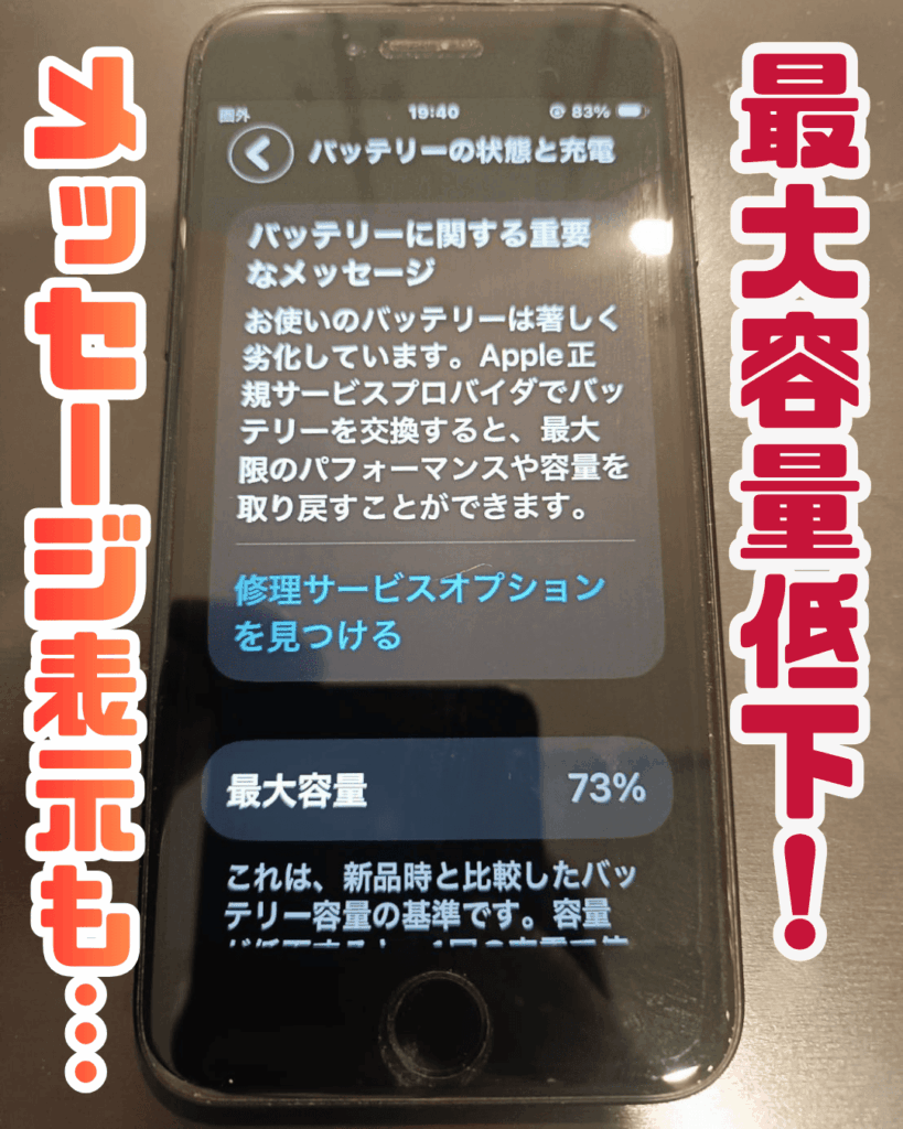 このバッテリー交換を薦めるメッセージは最大容量が80%を下回ると出てくるようになります。このメッセージ表示が交換目安と考えましょう!