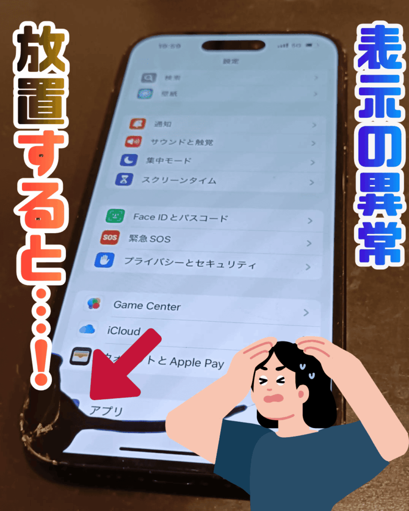 今のところガラス割れと黒シミのみですが、少し不便だけど使えるから〜と放置していると、先にお話した通り、故障が進行して見えない部分が増えたり、画面に内蔵されているタッチセンサー(画面操作を司る機能)が誤作動を起こし、触っていないのに勝手にアプリを開いたり電話をかけてしまったりといった故障を併発するおそれがあります。