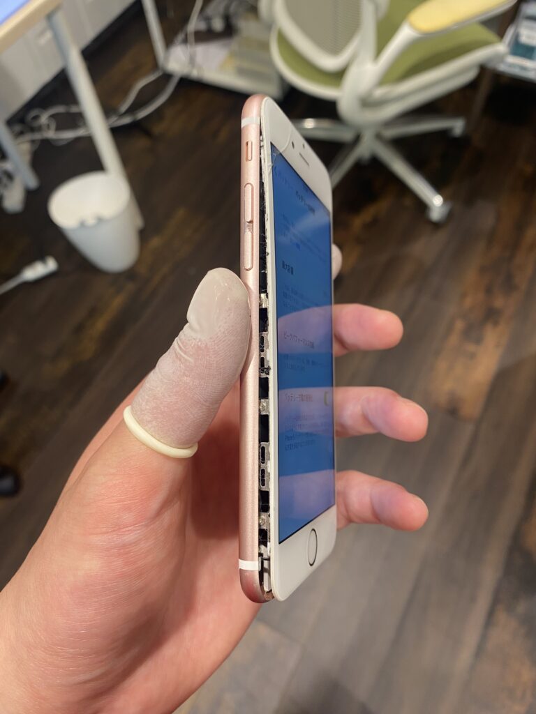 こちらのiPhone7、ご覧のとおり画面が浮いてフレームと噛み合っているはずのツメがあらわになっていますね。