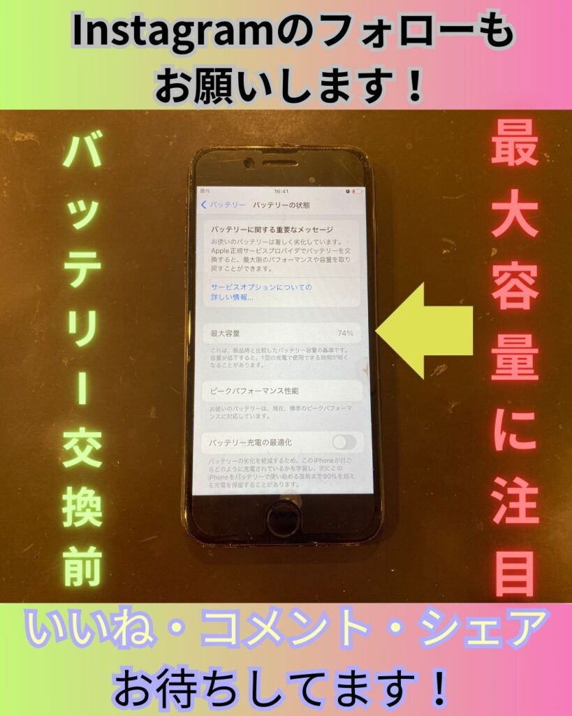 最大容量は74%、【バッテリーに関する重要なメッセージ】が表示されているiPhone7