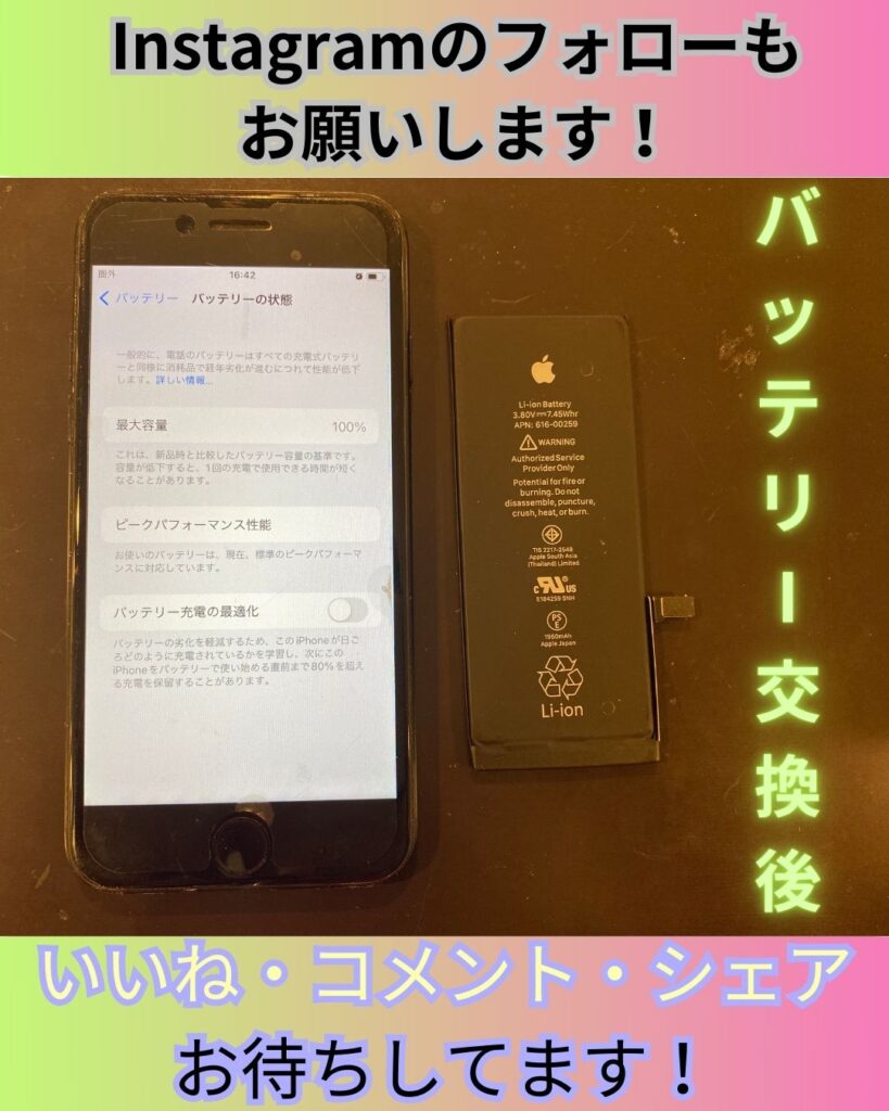 最大容量は100%で元気いっぱい!店舗スタッフで動作の確認を行い、他に不良箇所もなく、充電持ちも緩やかなため無事に快適なiPhone7へと復活しました\(^o^)/
