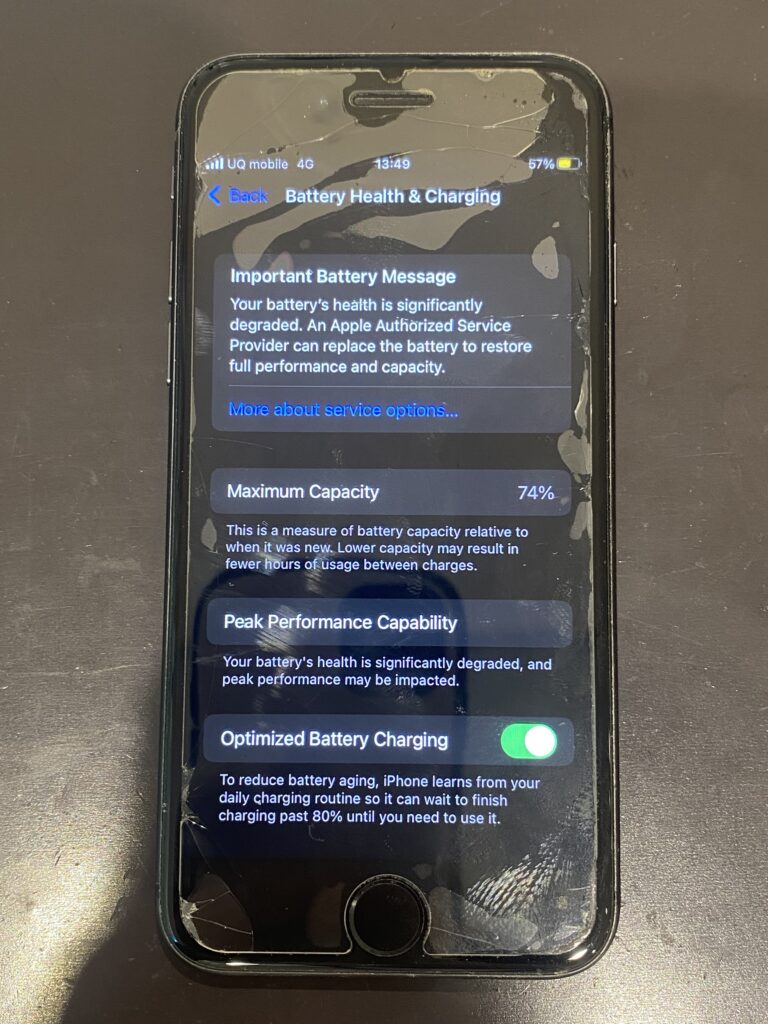 こちらのiPhone8のバッテリーの状態を見てみると、Maximum Capacity(バッテリーの最大容量)が74%と表示されています。