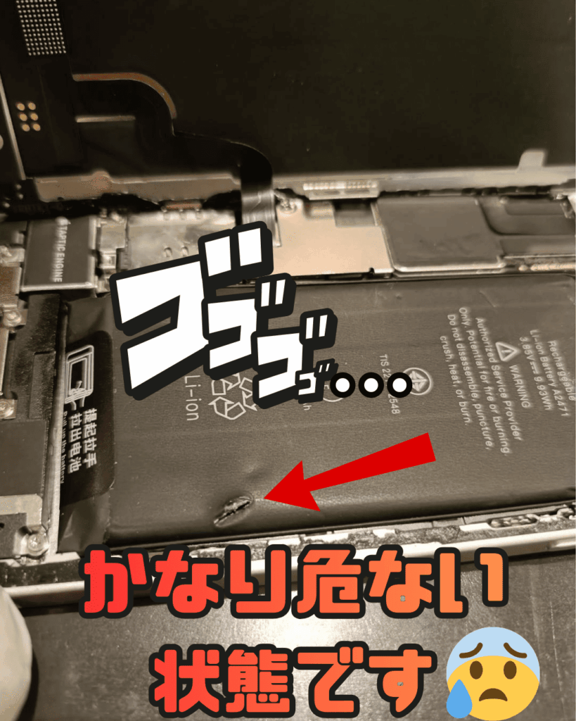 どうやらぶつけた時に画面を貫通してバッテリーまで傷付けてしまったようですね・・・。