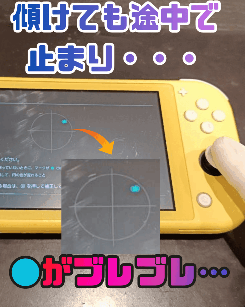 スティックが正常なら傾けた時に円に沿うはずが、抵抗が発生して途中で止まってしまい、丸いカーソルもブレブレしています。