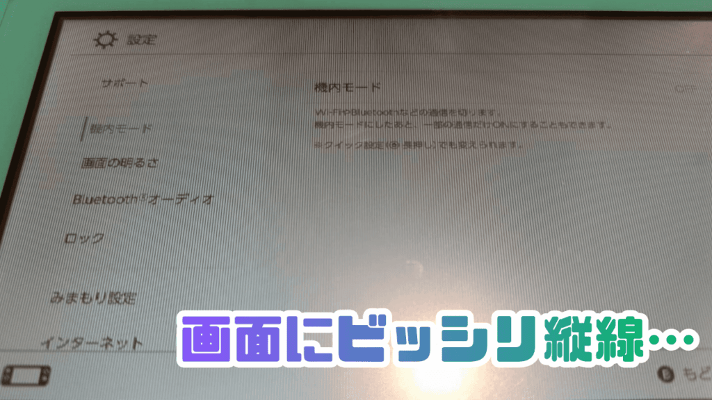 状態を確認すると、画面全体に無数の縦線が入り、本来のメニュー画面が非常に読み取りづらくなっています。
