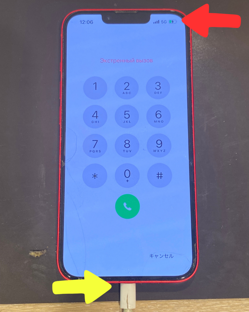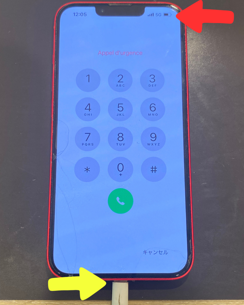こちらのiPhone13は、充電ケーブルを挿しているにもかかわらず、右上の充電マークが反応していません。