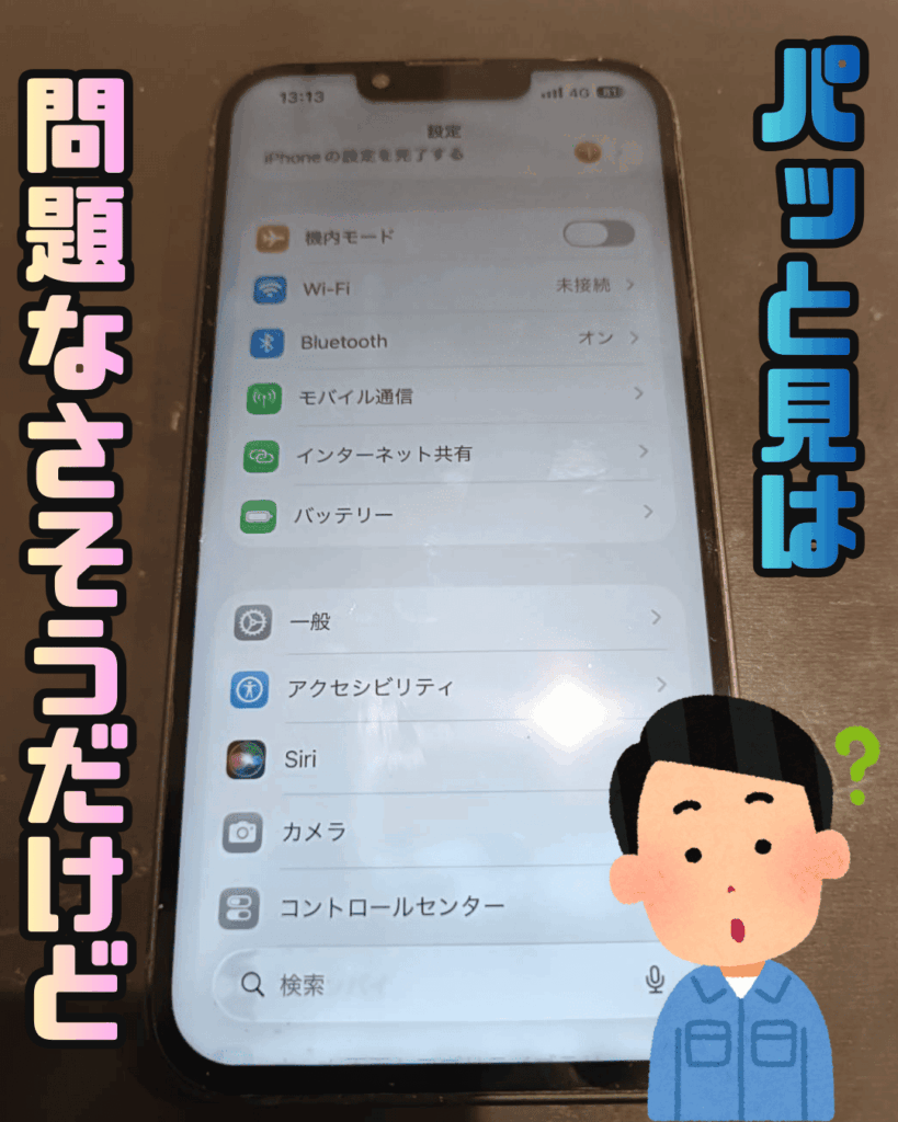 今回お預かりしたのはiPhone13。一見、何の問題もなさそうですね。