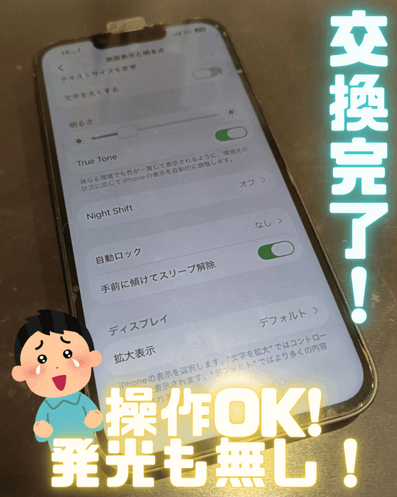 もちろん新しい画面なので発光もありません。しっかり直ったようですね。