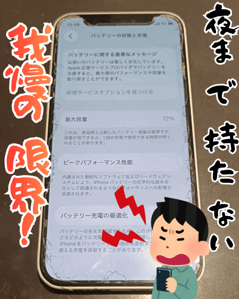 更に劣化が進むと突然の起動不良や、画面を押し上げるほどのバッテリー膨張を招くおそれがあります((((;゚Д゚))))